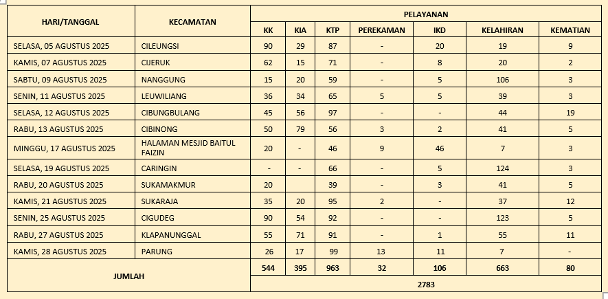 Sebagai salah satu perwujudan Visi Misi daerah serta rangkaian Program Kunjungan Kerja Bupati/Wakil Bupati Bogor dalam Rangka Peringatan Hari Ulang Tahun (HUT) Kemerdekaan RI Ke-80 di Kabupaten Bogor, Maka Dinas Kependudukan dan Pencatatan Sipil turut berpartisipasi dalam rangka Gebyar Pelayanan Terpadu yang diselenggarakan di beberapa kecamatan.