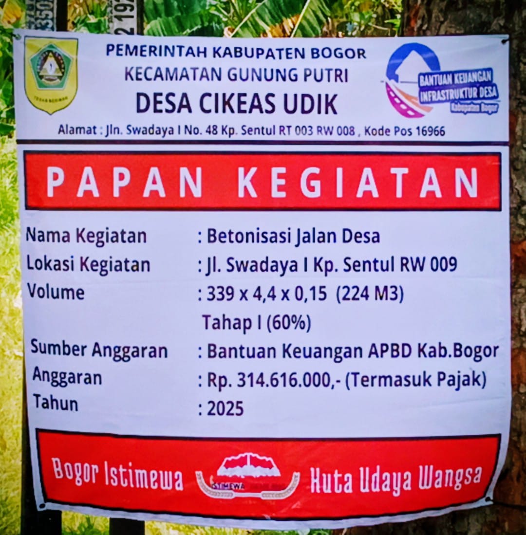 Jalan Desa yang dibangun tersebut berada di Kp. Sentul RW 009, Jl. Swadaya Desa Cikeas Udik Kecamatan Gunung Putri Kabupaten Bogor dengan volume Betonisasi: P.339 M x L.4,4 M x T.0,15 M (224 M3) akan menyerap anggaran sebesar Rp 314.616.000, (Termasuk Pajak).