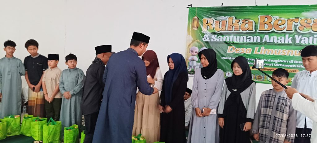 Guna mempererat tali silaturahmi dan berbagi kebahagiaan dengan anak-anak yatim, Pemerintah Desa Limusnunggal Kecamatan Cileungsi Kabupaten Bogor mengadakan acara Buka Puasa Bersama dan menyalurkan santunan kepada ratusan anak yatim di aula Kantor Desa setempat Sabtu (7/3/2026).